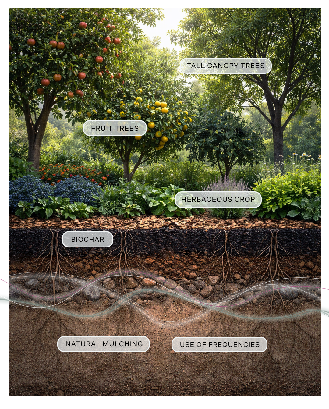 The farm has been applying the principles of biomimicry to support nature with a unique mix of organic, regenerative, biodynamic, agroforestry, effective microorganisms, biochar and quantum physics techniques.